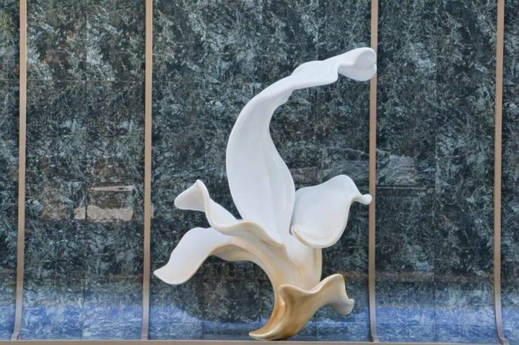 架空层以香槟金铝板和大面积爱马仕灰石材墙面装饰,提升了整体空间的豪华感。