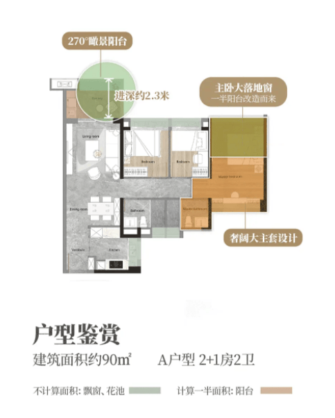 90㎡户型总价约270万起,双阳台设计,部分单位可享山景