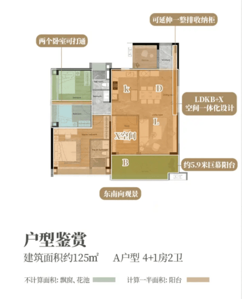 125㎡户型总价约400万左右,四开间朝南,U型厨房搭配生活阳台
