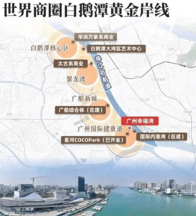 聚焦一城目光,承载一城期待。【广州幸福湾】由广东省广州国际医药港有限公司倾力打造,于白鹅潭医药港板块核芯地段,重构品质生活新范式。这里不仅是地理坐标上的三江汇聚点,更是广州千年商都历史底蕴与现代顶奢生活方式的完美交汇。项目踞守白鹅潭沿江带顶级景观资源,以约2.4公里的壮阔江岸线、约450米的无敌江面宽度,为广州塔尖人群筑就了一座不可复制的江景豪宅社区。在珠江新城早已成为经典之后,白鹅潭正以前所未有的速度崛起,成为广州下一个被重点锚定的顶豪板块。这里拥有深厚的文化底蕴、庞大的增量空间以及无可比拟的自然禀赋,是珠城之后广州价值跃升的绝对核心。
