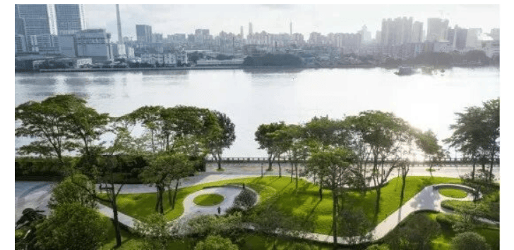 【休闲配套实测】 项目处于三江环抱地,家楼下纵享无界亲江,揽广州市区唯一2.4km至美江岸线。社区举步可达江岸休闲公园、滨江文化公园、广钢中央公园,一江三园的绿养生活体验。外部得天独厚的滨江环境,更要求项目在内部园林的打造上更具用心,能与外部的自然景观相融。