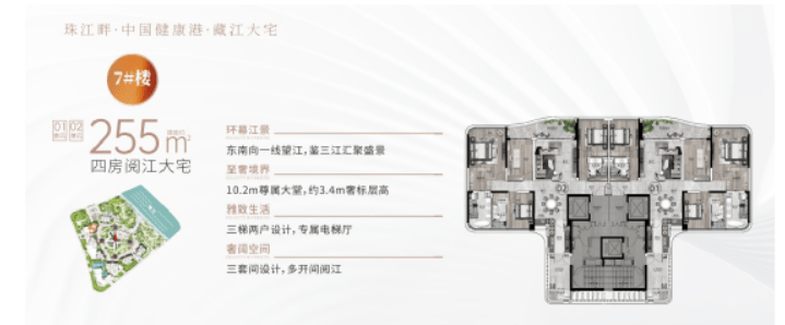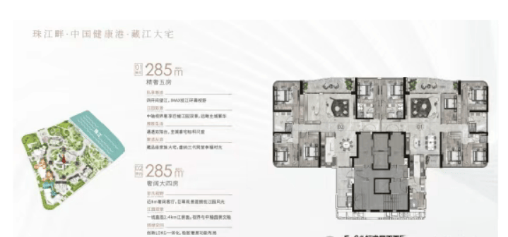 【广州幸福湾】在售户型主要为建面约233-285㎡的四至五房,全部为东向/东南向一线望江户型,拥有极致的3.4-3.6m层高。以下是对各户型的详细解析: