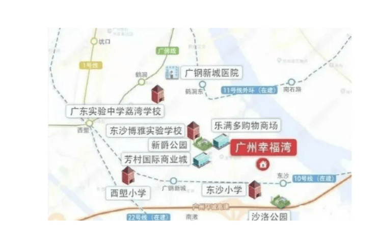 【广州幸福湾】所处的白鹅潭医药港板块,拥有极其丰富的教育资源、便捷的交通网络、成熟的商业体系以及优质的医疗配套。以下是对各项配套的实测距离与时间分析: