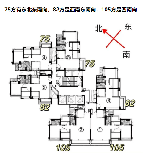 1 - 2 号楼均有在售,为 3 梯 6 户 49 层高的设计,2024 年 12 月交楼。在售户型包括 75 方(东北东南向)、82 方(西南东南向)、105 方(西南向),户型使用率达到 95%左右,例如 75 方能够设计为三房两卫,在空间利用上具有较高的性价比,满足不同家庭结构的居住需求。