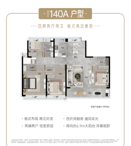 建面约140a㎡高定四房:该户型拥有少有高层景观,视野更开阔,让业主能够尽情欣赏周边美景。采用板式布局,南北对流,阳光满格,室内光线充足、空气流通。全屋精装交付,按照酒店式星级居所标准打造,为业主提供高品质的居住体验,性价比至高。