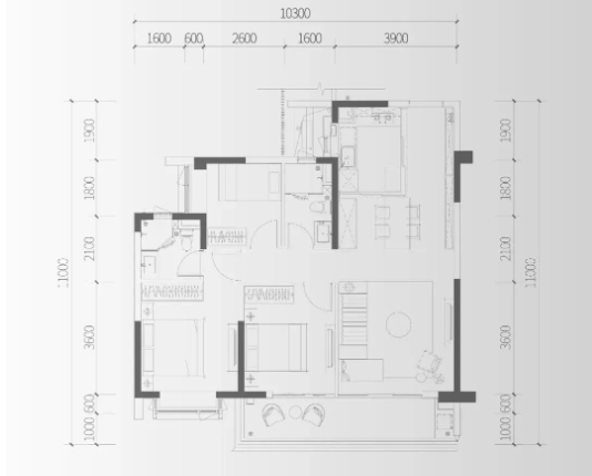A户型建面约110㎡,规划为三房两厅两卫,是刚需与改善过渡的优质选择。该户型最大亮点是约6.9m巨幕景观阳台,采光与观景效果极佳;三开间朝南设计,确保室内充足的采光与通风;独立主套房配置,带全明大飘窗,保障了主人的居住私密性与舒适度。