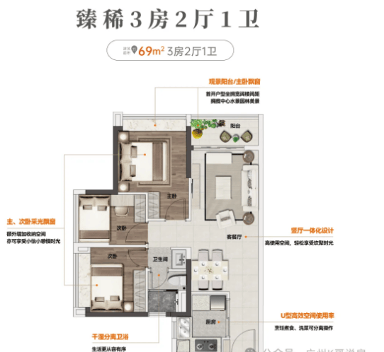 建面约69㎡ 3房2厅1卫:该户型为紧凑三房设计,完美适配单身青年或小家庭居住。户型配备阔绰观景阳台,直面中心水景园林,推窗即可欣赏绿意美景;主、次卧均带有采光飘窗,有效提升室内采光与通风效果,让空间更显通透明亮。