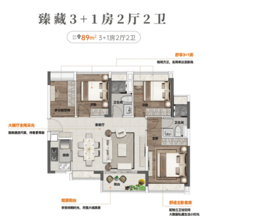 建面约89㎡ 4房2厅2卫:作为户型升级款,该户型采用独立单边位设计,实现南北对流,通风采光效果极佳。大横厅南向布局,兼顾采光、通风与景观视野,客厅空间开阔,是家庭聚会、休闲娱乐的核心区域。