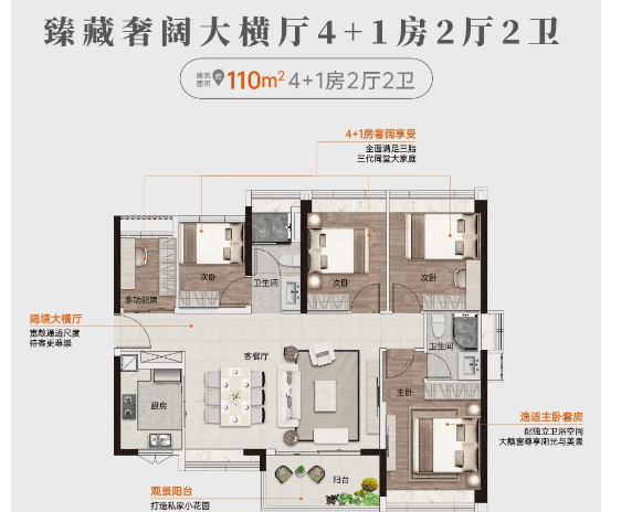 建面约110㎡ 5房2厅2卫:该户型为项目顶配户型,专为三胎家庭或大型家庭打造。户型打造专属私家小花园,业主可根据喜好打造绿植景观或休闲区域,享受专属私密空间;客厅与卧室均能享受大城与园林双景,居住体验极佳。