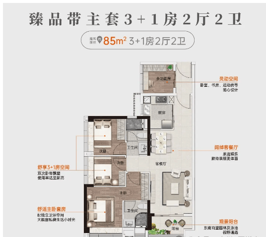 建面约85㎡ 4房2厅2卫:该户型以85㎡空间实现四房功能,使用率达至新高,完美适配二胎家庭或三代同堂居住。户型采用东南向布局,直面社区园林及泳池,景观视野极佳;双次卧均带有飘窗,进一步拓展空间感与采光效果。