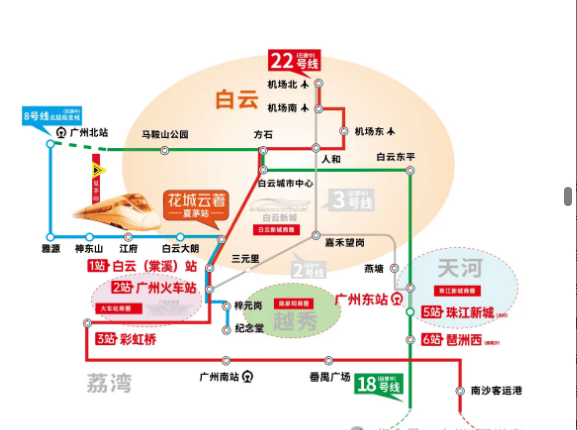 从项目出发,乘坐22号线北延段1站可达白云站,2站直达越秀,3站抵达老荔湾,换乘18号线后,5站即可直达珠江新城(冼村),轻松畅达市中心核心商圈。8号线北延段支线则串联越秀、花都等区域,直达广州北站和白云棠溪TOD,进一步拓展出行半径。
