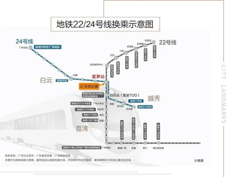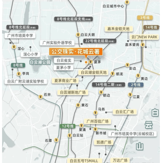 项目最大的交通优势的是双地铁上盖属性,距离地铁22/8号线北延段支线夏茅站仅约50米,真正实现“出家门进地铁”的便捷体验。其中,22号线北延段作为广州南北大动脉,时速可达160公里,贯穿空港、白云棠溪、广州火车站、南站等7大交通枢纽,全线换乘点多达16处,无缝衔接全市路网。