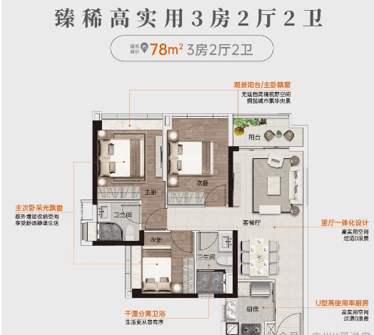 建面约78㎡ 3房2厅2卫:作为刚需爆款户型,该户型实现了三房两卫的全能配置,满足家庭成长需求。户型拥有无遮挡阔境视野,可俯瞰城市繁华央景与社区园林景观;空间利用率极高,过道零浪费设计,额外增加收纳空间,让家居物品摆放更有序。