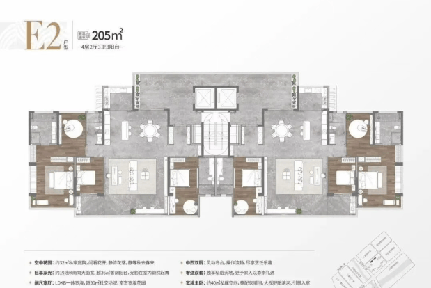建面约205㎡户型:中西双厨+灵动岛台+约32㎡庭院+约19.8米南向大面宽+超36㎡阳台+超90㎡社交空间+约40㎡主卧私人空间+双套房
