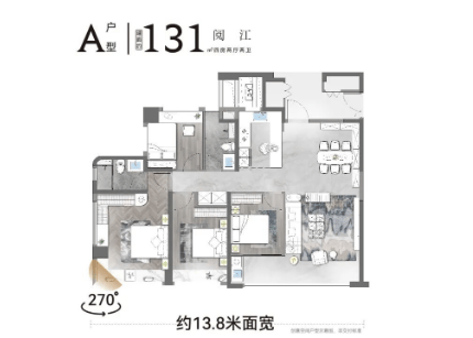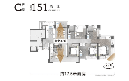 131㎡户型四开间朝南,南向采光面达 13.4 米,6.5 米面宽景观阳台连通次卧,主人房转角 L 型大飘窗呈现 270° 环幕视野,北向次卧双面采光。135㎡户型同样四开间朝南,南向面宽 15.8 米,南北对流双阳台,主卧三面飘窗呈现 270° 环幕视野。151㎡户型(C1、C2)4.5 开间朝南,南向面宽超 17 米,南北对流双阳台,景观阳台连通次卧,室内 LDKB、餐厨一体化设计,双套房设计且主人套房三面采光,270° 环幕视野,C2 户型独立玄关入户,厨房兼具中西厨模式,满足不同家庭的高品质居住需求。