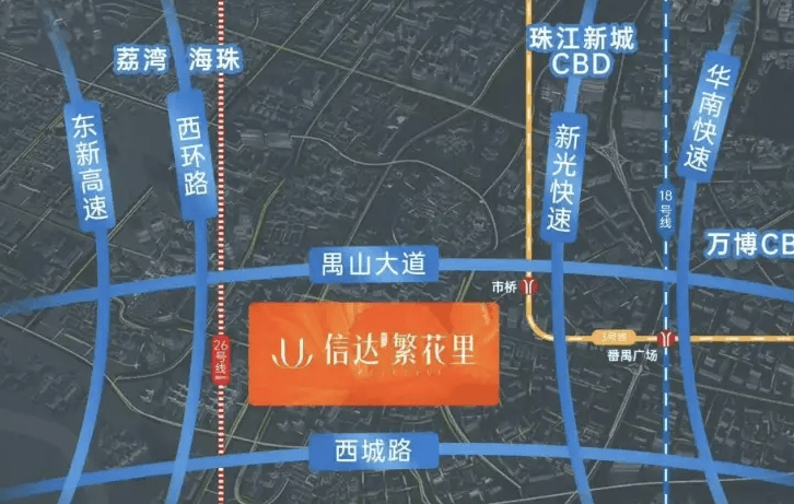 地铁 26 号线是广州第四期地铁规划中的南北向骨干线路,线路北起荔湾芳村,南至番禺榄核,贯穿荔湾、海珠、番禺三大区域,与地铁 3 号线基本平行,建成后将有效分流 3 号线的通勤压力,进一步提升广州南部的交通便捷性。根据目前公示的环评信息,地铁 26 号线有望在番禺禺山大道与西环路交界处、番禺广场、榄核等区域设站,其中禺山大道站临近信达繁华里等多个新建住宅项目,未来将为市桥板块的居民提供更便捷的地铁出行服务。