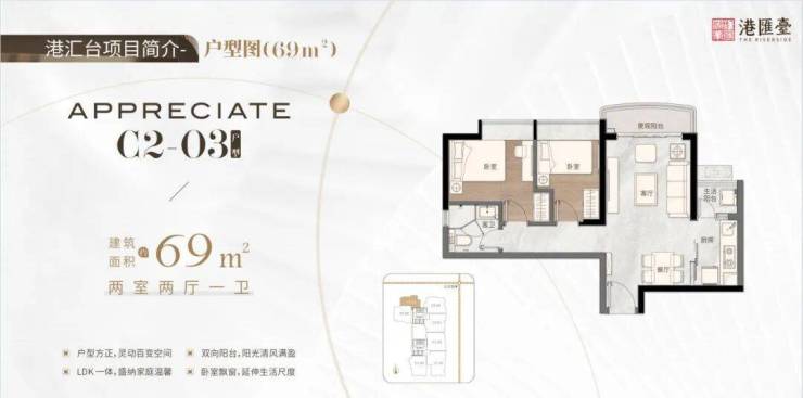 69㎡两房两厅一卫:户型方正,灵动百变空间,双向阳台,阳光清风,视野开阔。