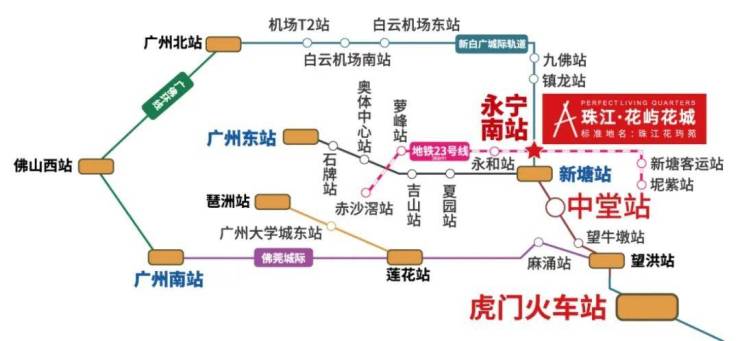 项目仅靠新白广城际的永宁南站,这是珠三角城际路网的重要组成部分,从新塘站开到白云机场,途经广州花都区、白云区、黄埔区、增城区,是广清城际、莞惠城际、穗莞深城际的连接线。