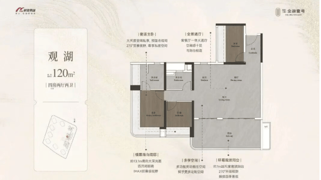 约120㎡四房两厅两卫,东南向,是大宅之家的首选。百米楼间距园景,让居住环境更加静谧私密,同时也保证了极佳的景观视野;环幕景观阳台约7m大尺度宽境设计,270°开阔视野,推窗即可俯瞰社区中央大花园的美景,远眺即可欣赏金山湖的湖光山色,享受IMAX巨幕级视野;全景通厅设计,客餐厅一体大通厅,延伸了空间视野,让客厅显得更加宽敞大气,适合家庭聚会或朋友宴请;约13.1m采光面,四开间朝南,南北通透大开间,让阳光与清风时刻相伴,营造温暖舒适的居住环境。这款户型空间宽敞,布局合理,品质感十足,完美满足大宅之家的居住需求。