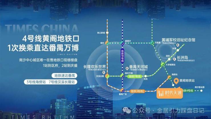 项目紧邻地铁四号线黄阁站,直线距离约80米,步行可达。四号线作为广州南北向地铁干线,连接天河公园、珠江新城等重要商务区,为跨城通勤提供便利条件。