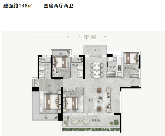 建面约133-138㎡四房:四开间朝南,双套房设计,LDK一体化,空间感强,适合改善型买家。