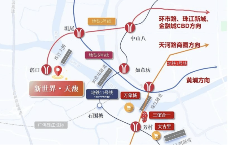 新世界天馥位于荔湾区滘口核心,紧邻白鹅潭CBD与广钢新城双发展轴,区位优势明显。项目与地铁5号线滘口站直线距离约400米,步行6分钟即可抵达,快速通达珠江新城、金融城、天河北等城市主心脏区域,无需换乘即可贯穿广州东西。未来地铁11号线与6号线的换乘节点亦将增强片区通达性,实现三线互联。周边道路体系完善,临近芳村大道、广珠西线、珠江隧道与华南快速干线,自驾出行便捷畅通。值得一提的是,项目在地铁与小区之间还规划有特色公园式街区,业主回家可穿越绿荫步道,感受静谧与仪式感并存的归家体验,真正做到出则繁华,入则宁静。