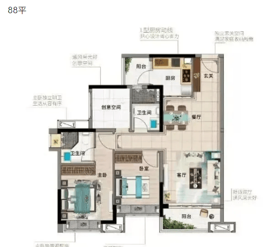 88㎡三房两卫户型:户型采用南北双阳台设计,通风采光极佳,同时增加了收纳与活动空间。客厅与餐厅相连,形成开阔的公共区域,适合家庭聚会、日常活动。主卧带飘窗设计,延伸了室内空间,增加了采光与观景效果;次卧空间方正,布局灵活,可根据需求调整功能;卫生间干湿分离,保障了使用卫生。该户型细节设计到位,居住体验出色,适合三口之家居住。