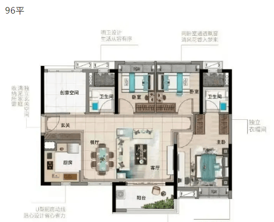 96㎡三房两卫/四房两卫户型:该户型为改善型刚需户型,空间宽敞,布局合理,可根据家庭需求调整为三房或四房。客厅宽敞明亮,连接超大观景阳台,园林景观尽收眼底;主卧套房设计,配备独立卫生间、衣帽间和飘窗,舒适性与私密性兼具;书房空间可灵活改造为儿童房、长辈房或储物间,满足家庭不同阶段的需求。厨房与餐厅相邻,动线合理,方便用餐与清洁。该户型适配性强,适合多孩家庭或有改善需求的家庭。
