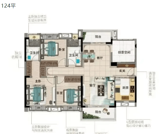 124㎡四房两卫户型:该户型为项目主力改善户型,空间开阔,四房两卫设计满足大家庭居住需求。户型南北通透,采光通风俱佳,客厅与餐厅分区明确又相互连通,形成开阔的活动区域。主卧套房空间豪华,配备独立卫生间、衣帽间和超大飘窗,享受高品质居住体验;三个次卧空间充足,可满足长辈同住、儿童居住及书房需求;阳台宽敞,可作为观景、休闲或晾晒空间使用。整体户型布局大气,细节打磨到位,适合追求舒适生活的改善型家庭。