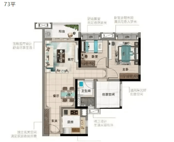 73㎡三房两卫户型:该户型为刚需首选户型,面积紧凑但空间利用率高,三房两卫设计满足小家庭基本居住需求。户型南北通透,采光通风效果好,客厅连接阳台,拓展了活动空间,同时保证了室内采光。主卧配备独立卫生间,保障了主人的私密性;两个次卧空间适中,可作为儿童房或书房使用;公共卫生间干湿分离设计,提升了使用便利性。整体户型布局合理,无浪费空间,总价友好,适合预算有限的刚需家庭。