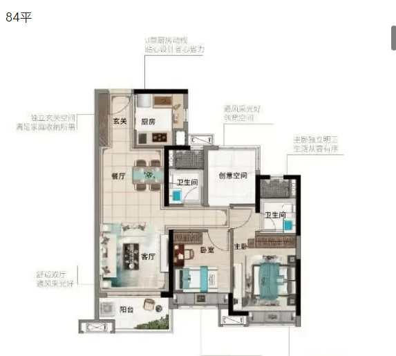 84㎡三房两卫户型:相较于73㎡户型,该户型空间更为宽敞,居住舒适度更高。客厅开间更大,搭配观景阳台,视野开阔,可欣赏社区园林景观。主卧空间充足,配备独立卫生间和衣帽间,满足收纳与私密需求;次卧采光充足,布局合理,适合作为儿童房或长辈房;厨房采用U型设计,操作空间充足,方便日常烹饪。该户型兼顾实用性与舒适性,适合追求品质生活的刚需家庭。