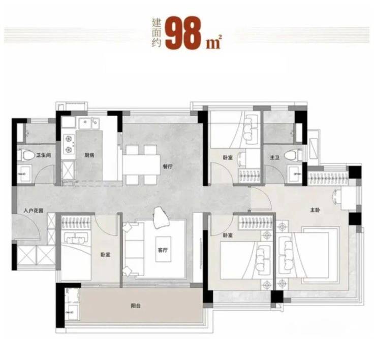 如果说82平方米户型是刚改客户的福音,那么建面约98平方米的四房两厅两卫户型则是改善家庭的终极梦想。这个户型采用了当下最流行的横厅设计,南北对流,通风效果极佳。南向面宽更是扩展到了14米,让整个客厅显得气势磅礴,宽敞明亮。