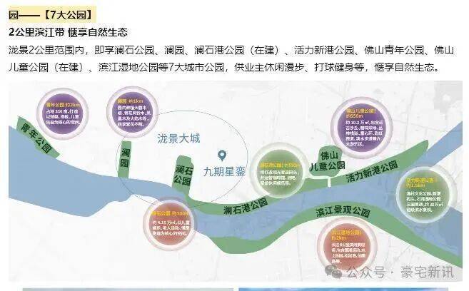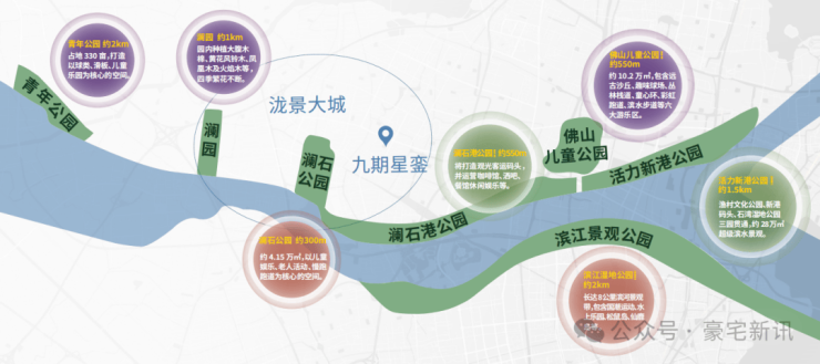 泷景2公里范围内,即享澜石公园、澜园、澜石港公园(在建)、活力新港公园、佛山青年公园、佛山儿童公园(在建)、滨江湿地公园等7大城市公园,供业主休闲漫步、打球健身等,惬享自然生态。