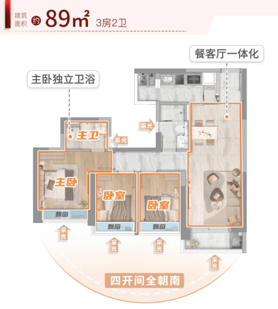 89㎡三房两卫是刚需改善的首选户型,总价约347万元起,比76㎡户型多了一个卫生间,居住舒适度更高,适合三口之家。这款户型最大的亮点是三开间朝南,间间带飘窗,采光通风效果极佳,每天早上,阳光能洒满整个房间,让人心情愉悦。