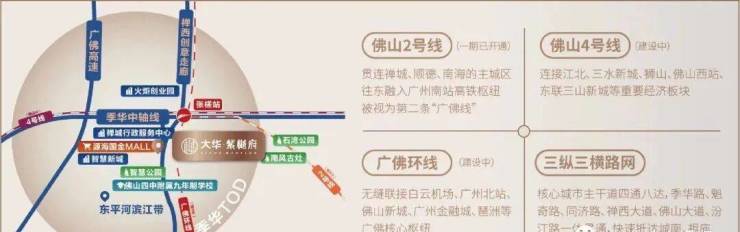 项目位于智慧新城CBD,以三轨TOD张槎站为枢纽中心,拥有广佛环线(建设中)、佛山地铁2/4号线(2号线已经通车)。其中广佛环线,串联四大湾区枢纽(广州北站、白云机场、广州南站、佛山西站),连接金融城、琶洲、智慧新城CBD等总部经济圈;未来广佛环线成环后,可辐射湾区6城。