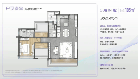 105㎡四房两卫:宽敞舒适,适合大家庭或追求高品质生活的购房者。