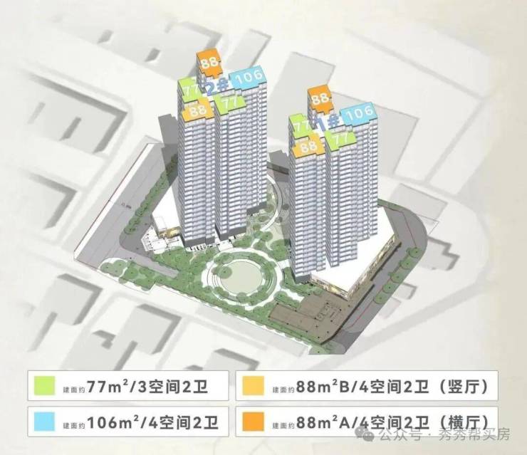 项目主打77㎡三房两卫、88㎡四房两卫、106㎡四房两卫三大爆款户型,均采用新规高使用率设计,使用率超 100%,0 飘窗设计(800mm 飘窗全打,不计入建筑面积),真正实现 “零浪费、高实用”,是荔湾刚需、刚改客户的最优选择。
