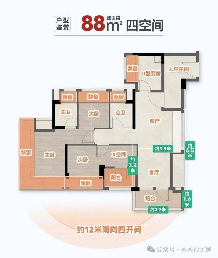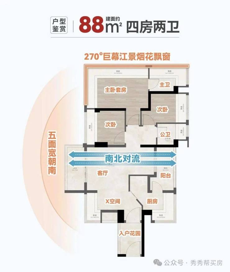 四房设计:88㎡做到四房,满足二胎家庭、三代同堂居住需求,空间利用率极高。