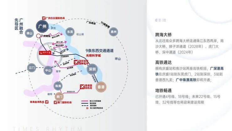 时代天逸的一大亮点在于其卓越的交通条件。项目紧邻地铁4号线黄阁站,步行仅需几分钟即可到达地铁口,两站可直达庆盛,在此换乘广深港高铁,进一步加强了与深圳、香港的联系。自驾出行同样便利,南沙大桥、狮子洋大桥(建设中)、虎门大桥和深中通道等多座跨海大桥构成了完善的交通网络。此外,项目周边还有多个公园环绕,如大山乸森林公园、体育公园、南沙儿童公园等,提供了丰富的休闲娱乐选择。