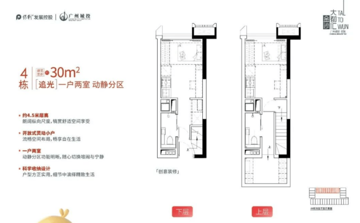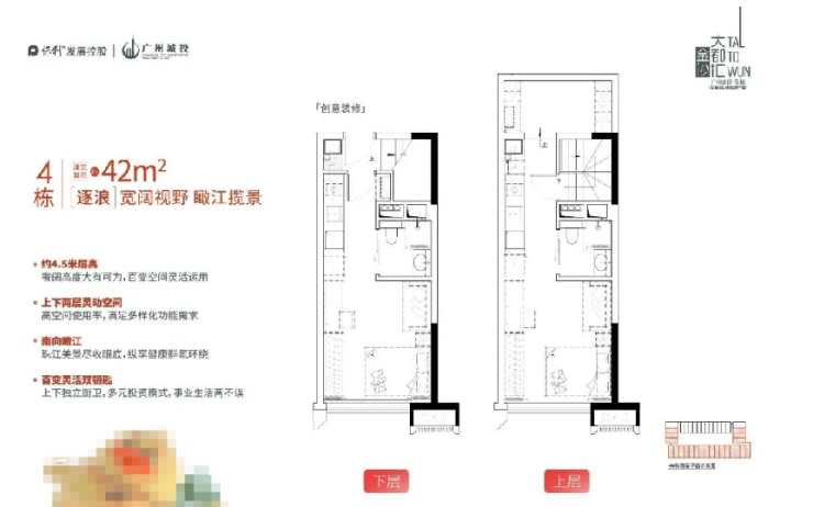 项目主打30-42平方米的小户型复式公寓,采用4.5米高的设计,既保证了居住的舒适性,又提高了空间利用率。每户均设有独立入户门,上下两层可以分开使用或出租,非常适合自住或投资。这种“双钥匙”设计为业主提供了更多的可能性,既能享受自住的乐趣,又能通过出租获取额外收入。