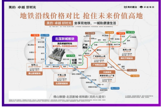 美的卓越好时光扎根顺德北滘新城核心居住区,坐落于裕和路主轴之上,地处佛山新城与广州南站的黄金衔接节点,隶属三龙湾高端创新集聚区桥头堡位置,是广佛同城核心发展红利的直接受益者。项目占位北滘TOD生态城核心圈层,片区整体规划投入规模庞大,长期规划红利充沛,依托千亿城市战略布局,逐步兑现一流城市配套资源,地段发展潜力持续释放。片区作为广佛知名智造强镇,汇聚两家世界五百强总部企业与十六家上市企业,产业基础雄厚、人口吸纳能力强,为片区居住价值与资产稳定性提供坚实支撑。交通层面打造双地铁、一城轨、六高速的多维立体路网,彻底实现广佛全域无界通勤。双地铁已全面落地,佛山地铁3号线北滘站、广州地铁7号线美的大道站均已通车运营,步行及短途骑行即可快速接驳,轻松直达广州主城、佛山各镇街。在建广佛环线城际轨道将进一步拉近广佛时空距离,多条城市快线与高速路网环绕,自驾可快速通达珠三角各大核心城市,全方位执掌湾区城市通勤速度,适配广佛跨城通勤人群长期居住需求。