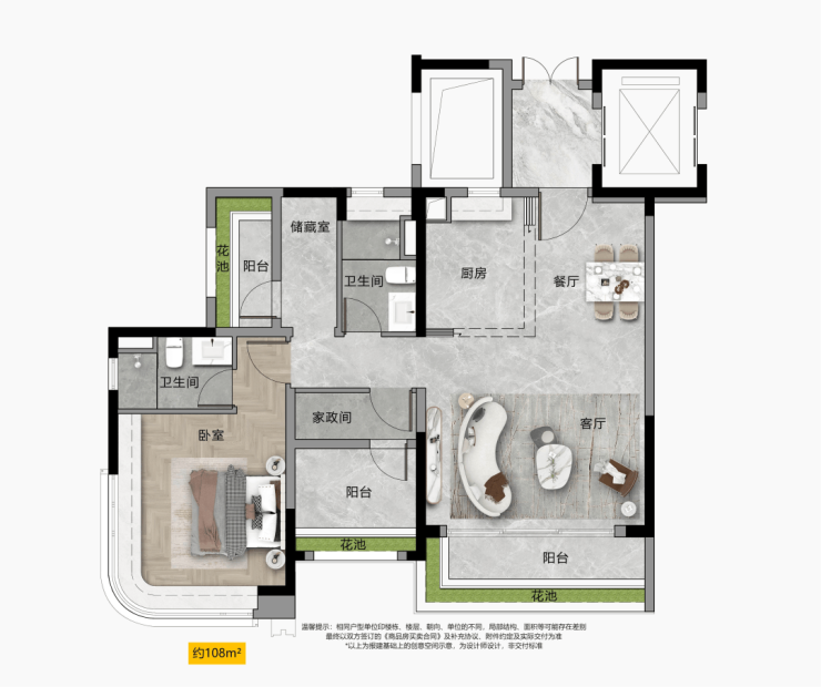 108-110㎡户型:做到了极致的入门级中轴奢宅,三房两卫,是进阶海珠圈层的首选,拥有约4.9米巨厅。