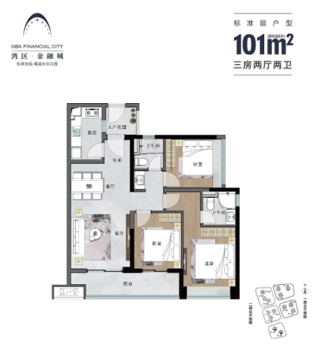 98㎡:3+1室2厅2卫,南朝向,多变空间设计,卧室全飘窗设计。