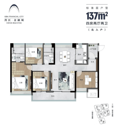 135㎡:4+1室2厅2卫,豪华景观阳台,南北对流全明设计。