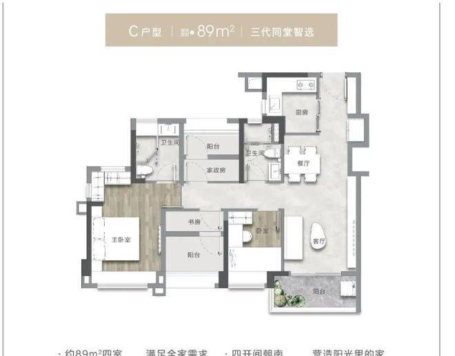 项目的户型设计注重实用性与舒适性的结合,得房率高达 95%,在同等建筑面积的情况下,相比其他楼盘多出两个空间,为居民提供了更为宽敞的居住体验。部分户型设计充分考虑家庭结构的多样性,例如 89㎡四房户型,合理的空间布局能够满足三代同堂家庭的居住需求。每个房间的尺度适宜,功能分区明确,动静分离,确保家庭成员的生活互不干扰,同时又能在公共空间享受温馨的家庭时光。这种实用的户型设计,既满足了当下家庭对居住空间的需求,又具有一定的前瞻性,适应家庭结构的变化,为居民打造舒适、便捷的居住环境。