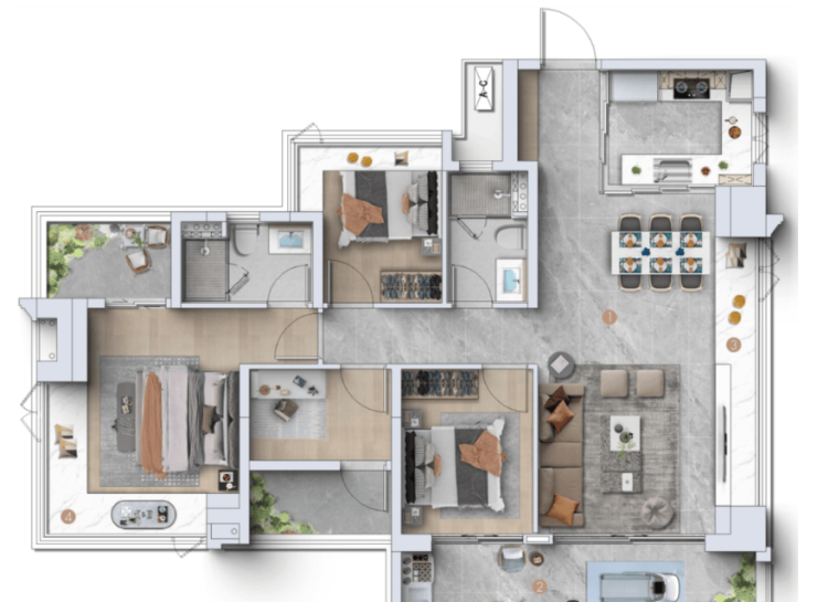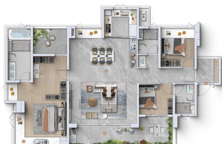江景王126㎡:L型飘窗环幕视野,约10㎡阔景阳台,灵活可变空间,满足不同生活需求。