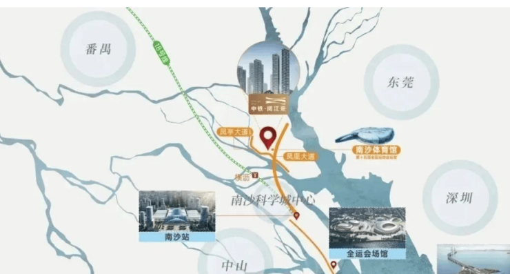 中心交通:两大主干道凤凰大道与凤亭大道贯穿其中,连接南沙枢纽站、深中通道等重要交通枢纽,实现便捷的大湾区通勤。