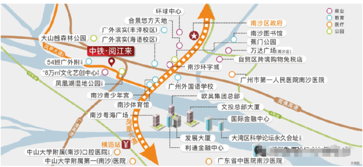 中心配套:通过凤凰大道连接南沙区府与明珠湾板块,汇聚了区内最完善的商业、娱乐设施。