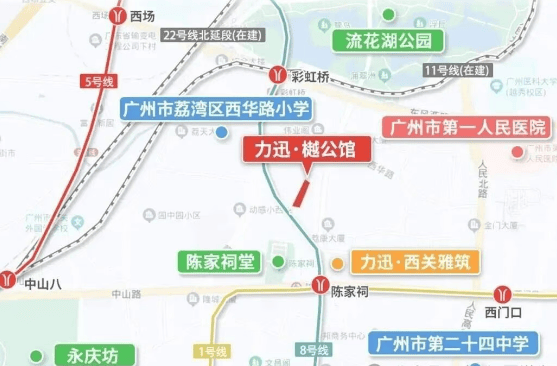 项目距离地铁8号线与11号线交汇的彩虹桥站约500米,步行时间不到6分钟。同时,1号线与8号线换乘的陈家祠站也在同等距离范围内。这意味着无论是去珠江新城、天河还是海珠,基本一次换乘就能抵达。尤其13号线二期开通后,从彩虹桥直达珠江新城的时间将进一步缩短,通勤效率在老城区里算得上便利。