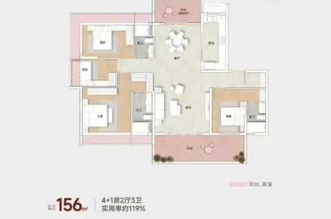 主力在售的108㎡四房户型,做到了四开间朝南,其中三间卧室都面向南侧。主卧独占东南角,带大飘窗和独立卫浴,私密性和通风效果都不错。厨房U型布局,操作动线合理;阳台连接次卧,既增加了采光面,也方便晾晒。更实用的是,这个面积段还能实现真正的四房功能,对二胎甚至三胎家庭很友好。